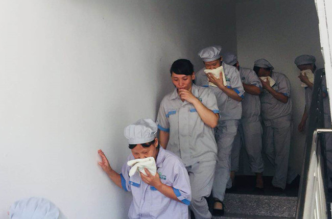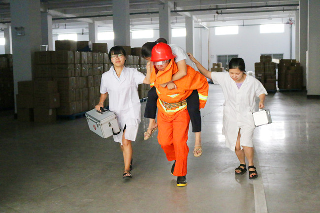 按照事先安排,下午13:30,制造二部一楼仓库“起火冒烟”,值班人员发现火情后,立刻报告安委会启动消防安全应急救援预案,模拟拨打119报警电话,并拉响警报。伴随着火灾警报的广播,各应急救援小组迅速集结,在统一指挥下有序开展救援行动。疏散引导小组立即组织公司员工打湿毛巾,捂住口鼻,弯腰从各楼层的消防应急通道撤离并到达指定地点集合。同时,现场抢险救援、警卫警戒、医疗救护、信息协调等一系列工作紧张而有序开展。